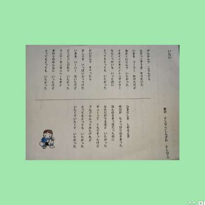 今週の詩は、「いたい」です。みなさんもきっとこのような経験があると思います。でも、けがはしないにこしたことはありませんね。家でも学校でも、身の回りに注意して、安全に過ごしたいですね。そのためには、家族や友だちが互いに「気を付けて、あわてずに」と声をかけあうといいですね。