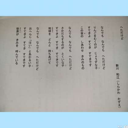 今週の詩は、「へただけど」です。だれだって得意なこともあれば苦手なこともあります。自分のことも、まわりの人のことも「へたなこと」や「にがてなこと」ばかりに目を向けないで、「とくいなこと」「じょうずなこと」を考えてみましょう。