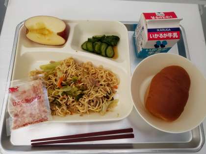 塩、こしょう、うすくちしょうゆ、こいくちしょうゆで味付けした焼きそばです。喫食時に、1人1袋あてのかつおぶしをふりかけていただきます。