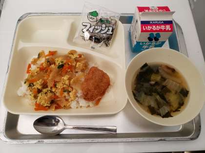 鶏卵の個別対応献立です。こんぶとけずりぶしから出した出汁を味付けし、たまねぎ、にんじん、青ねぎを煮て卵でとじた具をご飯にかけ、給食室で揚げたカツをのせていただきます。