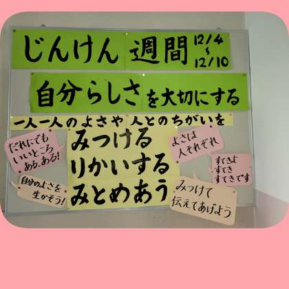 校長先生からh、「じんけん週間」のお話がありました。校長室の前には、掲示もしてあり、子どもたちは、立ち止まって見ています。