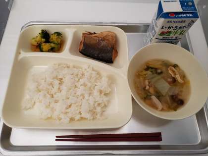 だしこんぶを落としぶたにして煮含めたさばは、コクがあり味がよくしみていました。ただ、骨付きのさばだったので、低学年を中心に食べるのに苦戦している子どもが多く、いつもより時間がかかっていました・・・