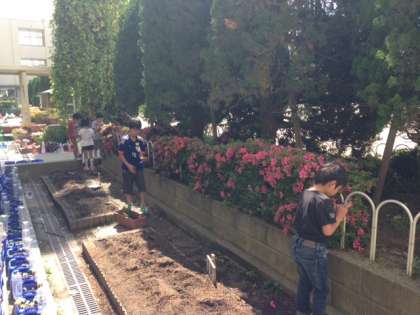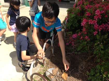 「ダンゴムシ」は子どもたちにとって身近で親しみやすいようで、毎年、ダンゴムシ探しに夢中になる子が必ずいます。先週の木曜日も、1年生教室前の花壇付近で5年生が黙々とダンゴムシを集めていました。「何してんのん?」と1年生が寄ってきて5年生と頭を寄せ合ってダンゴムシの観察が始まりました。「さて、ダンゴムシのあしは何本でしょう?」と私が尋ねると、「14本」、「ダンゴムシは昆虫ですか?」「ちがいます」「どうして?」「足が6本じゃないから」という返事。さすが5年生。「それは前にもう習いました」ということでした。