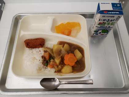 今日の給食は「入学祝い献立」です。牛肉を主材にしたカレーライスに、給食室で揚げた一口トンカツを添えていただきます。入学と進級のお祝いの気持ちを込めて調理員さんがお花型に切り抜いてくださった、「ラッキーにんじん」が入っています。久しぶりのカレーライスの登場に、やったー!の声があちこちから聞こえてきていました。