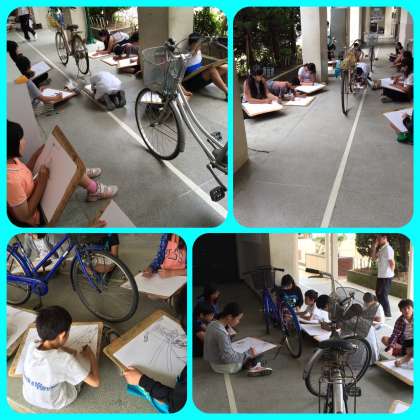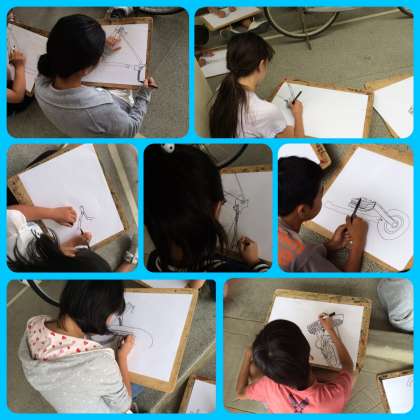 自転車の回りに座り、よく観察しなからとても細かい所まできちんと描いていました!!!