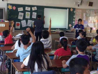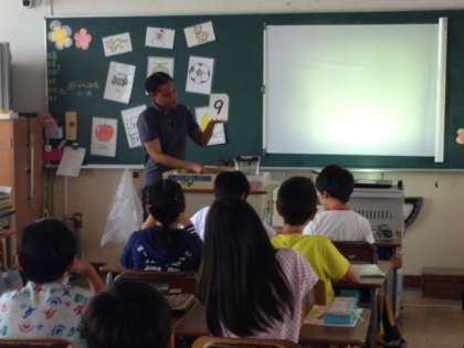 Tamara先生が、数字カードを示しながら、“What number?”と問いかけると子どもたちが“three”“eleven”“twenty”というように答え、数を英語で唱える練習をした後、Textの“How many 〜”クイズをし、英語の数詞に慣れる学習をしました。