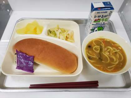 800人分の給食を作る大きな釜やタライ、大きなしゃもじのような櫂、8人の調理員さんが、自分たちが食べる給食を調理されている姿など、給食室でしか見ることができないものに興奮気味の子どもたち。湯気や匂いにも刺激されて「お腹すいたー!」の声がたくさん聞こえました。