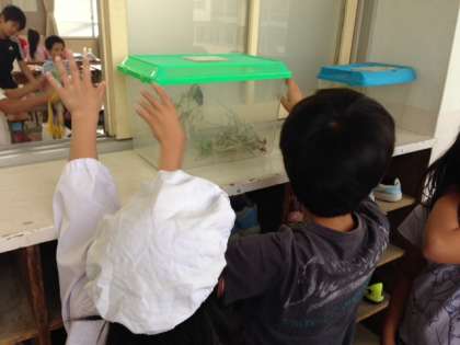 3年生は理科の学習で、各クラスともアゲハチョウやモンシロチョウを育てています。卵→幼虫→さなぎ→成虫という成長の様子を観察しています。この学習では、昆虫の育ちには一定の順序があり、成虫の体は頭、胸及び腹からできていることを学びます。実際に飼育するうちに、アゲハチョウの幼虫と、モンシロチョウの幼虫では食べるものが違う、さなぎの大きさが違うなどに気付いたと思います。この学習がきっかけとなり、トンボは?バッタは?カブトムシは?アリは?・・・というように昆虫に対する興味、関心が高まり、自主学習が広がっていくことを期待しています。