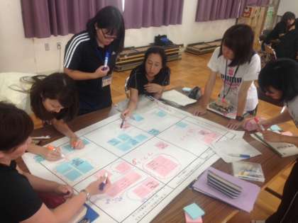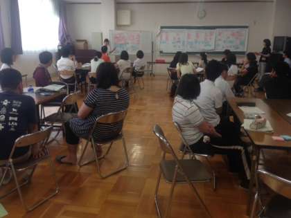 授業研究会を行った後、放課後には全教員が集まって、授業についての討議を行います。条件の提示の仕方はよかったか?自分の意見を説明するグループはあれでよかったか?子どもたちの自己評価の項目はこれでよいか?などさらにわかりやすい授業をめざして、話し合いを深めました。