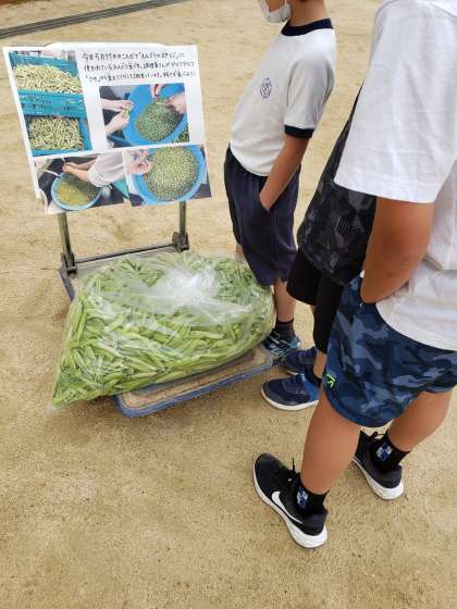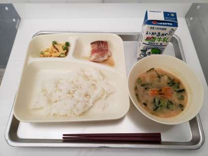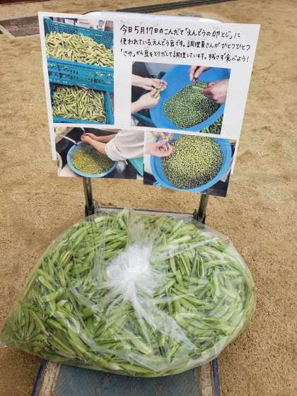 今日の「えんどうの卵とじ」に使われたえんどう豆は、ひとつひとつ給食室で「さや」から豆を取り出して調理しています。旬のえんどう豆の歯ごたえと味を楽しめる献立です。