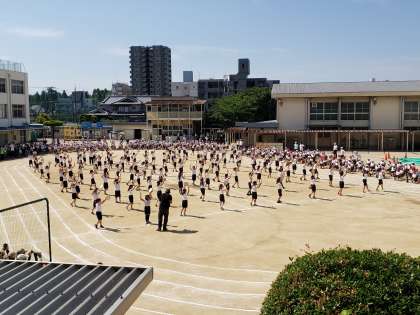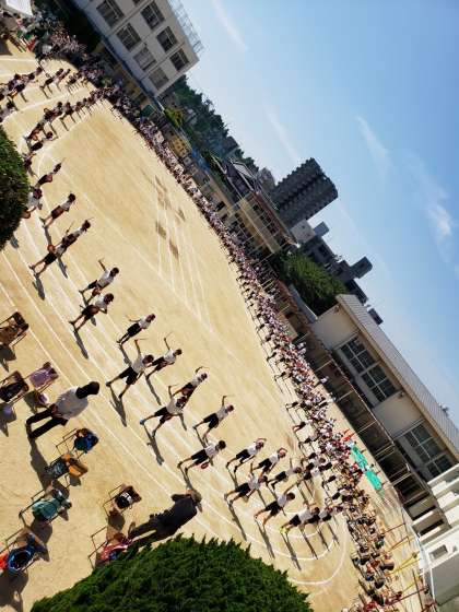 プログラムのトップを飾る4年生の団体演技は、力強いパーランクの音を青空に響きわたらせながら、エイサーを踊りました。