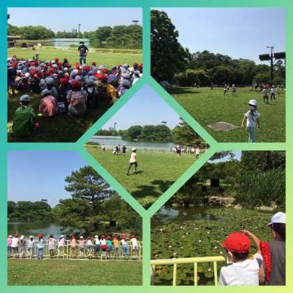 池のそばの広場で自由時間になり、子どもたちは走り回ったり、池にすむ魚や動物を観察したりしています。
