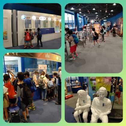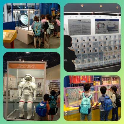 体験できるものや、発明品など興味深く子どもたちは見学しています。