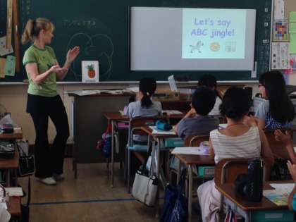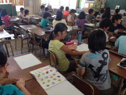 今年度も校長経営戦略予算を活用して、地域にお住いのAngela先生に、1年生から6年生までの英語活動の支援をしていただきます。先週からお越しいただいています。今日は、5年生が“Let’s say ABC jingle”を楽しんでいました。最後に,Angela先生と子どもたちで2拍ずつ手を叩きながら、リズミカルに単語を唱え、予め指定しておいた単語が出てきたら、隣同士二人組の間においてある消しゴムを素早くとるというゲームをしました。
