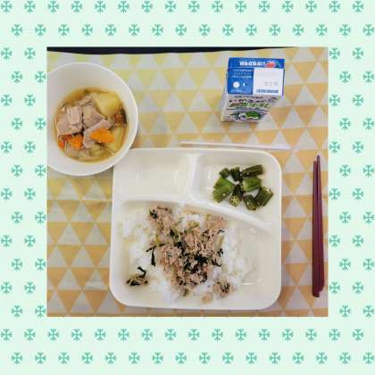 今日の給食の献立は、ご飯、牛乳、豚肉とじゃがいもの煮物、オクラの梅風味、ツナっ葉炒めでした。入っている食べ物は、黄、エネルギーになる、ご飯、じゃがいも、砂糖、サラダ油。赤、体をつくる、牛乳、豚肉、削り節、ツナ。緑、体の調子を整える、玉ねぎ、人参、さんど豆、オクラ、梅肉、大根葉。