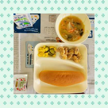 今日の献立は、コッペパン、牛乳、鶏肉のから揚げ、中華味噌スープ、きゅうりとコーンの甘酢和え、りんごジャムでした。