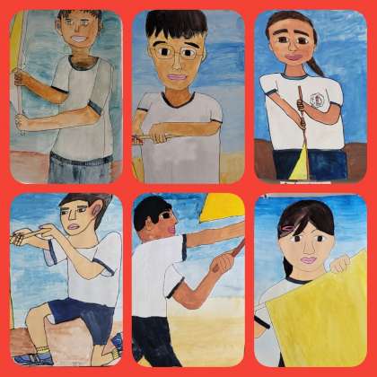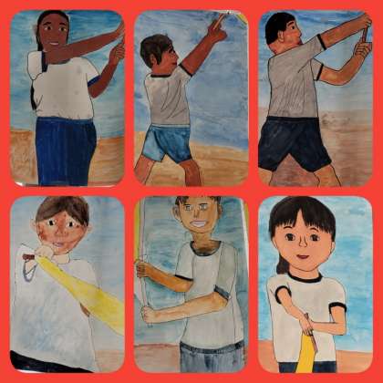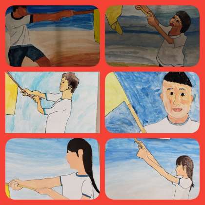 小学校最後の運動会、力強く旗をふる様子が描かれています。