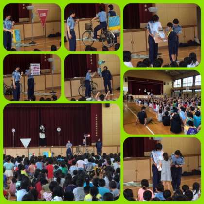 ○×クイズを出していただき、パンダのパンくんと一緒に自転車の乗り方についてわかりやすくご指導いただきました。被害者になっても、加害者になっても本人はもちろん、家族みんなつらい思いをします。ルールを守り、安全に気をつけて自転車に乗るようご家庭でもご指導ください。