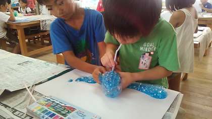 シャボンをふくらませて色や形がどんどん変わっていくのを見ると、イメージも大きくふくらんでいきました。画用紙にうつしとると、素敵な模様ができました。
