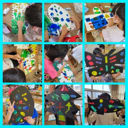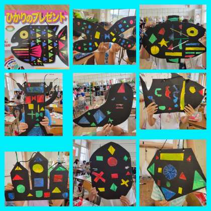 「ひかりのプレゼント」では、はじめてカッターナイフを使って、台紙を切り抜きました。切り抜いた形の部分にセロファンを貼りながら、素敵なプレゼントを作りました。