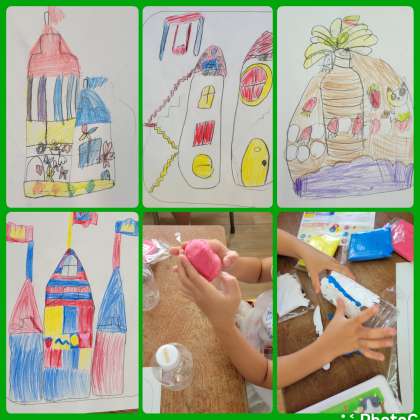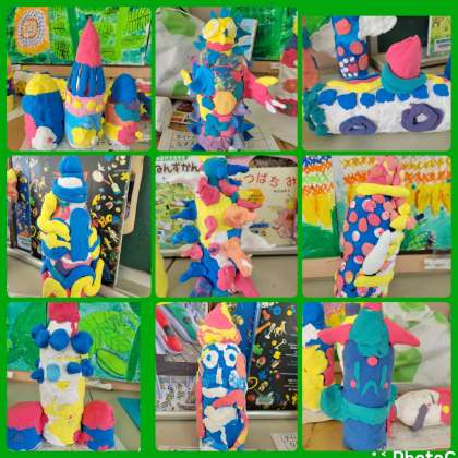 カラフルねん土で、「建物」や「乗り物」を作りました。二色を練り合わせて、新しい色を作るのも楽しいようでした。