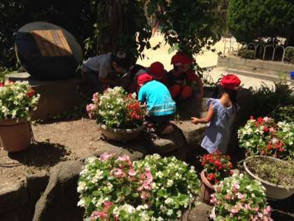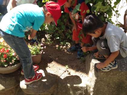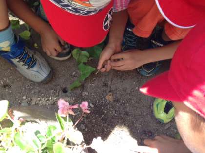 休憩時間、運動場で遊ぶ子どもたちを2階の窓から見ていると、1年生の男の子が二人、「校長先生!たいへん!アリの大群が行列してる!来て、来て!」と階段を駆け上がってきました(普段、子どもたちは階段を、静かに?歩いていますが・・・)。ついて行くと、ヤシの木が生えている花壇を本当にたくさんのアリたちが忙しそうに歩いていました。見ていると、穴に向かって行列ができています。「あっ、ダンゴムシがつれていかれてる。助けなあかん。」「なんか棒ないかなあ」と子どもたちが言っているうちに、ダンゴムシが自力で穴から這い上がってきました。一人の子が「ねえ、なんでこんなに行列作ってんの?」と尋ねるので、「冬に備えて今のうちから食べ物を集めてるんとちがうかなぁ」と答えました。合ってるでしょうか?よく目を凝らすと、さまざまな生き物が懸命に生きている姿が見えてきます。