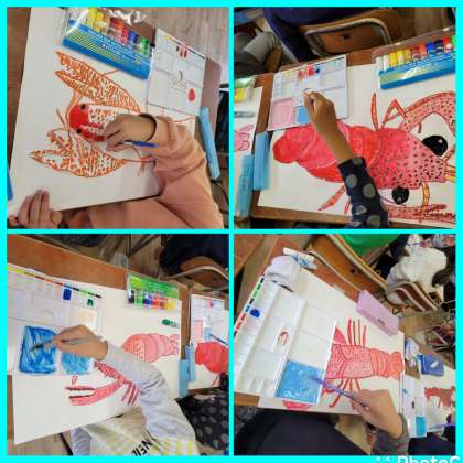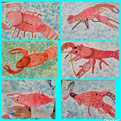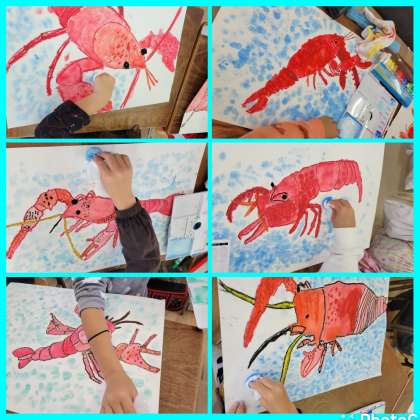 ザリガニを塗った後、水の色を工夫して、ポンポンとつけていきました。