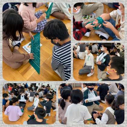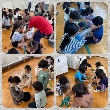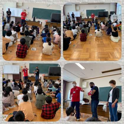 日本赤十字社から、ボランティアの方3名に来ていただいて、ビニール袋を使った止血、ハンカチを使った包帯、教科書を使った固定など、応急手当の体験学習をしました。