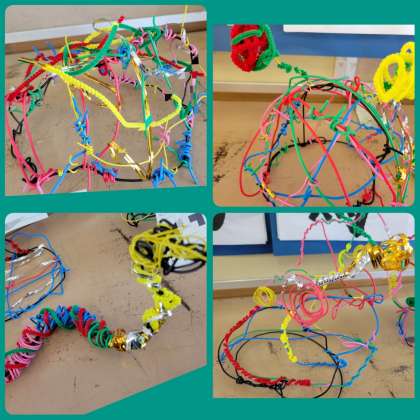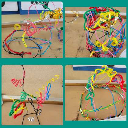 曲げたり巻いたりしながら、つくりたい物の形のイメージを広げました。