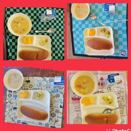 今日の献立は、黒糖パン、牛乳、豆乳コーンクリームシチュー(米粉)、白菜のピクルス、柿です。柿は、日本で古くから栽培され、『柿が赤くなると医者が青くなるということわざ』があります。これは柿を食べると病気にならず、医者がいらなくなるという意味や、柿が色づく季節は気候がよくなり、病気の人が少なくなるという意味などがあります。