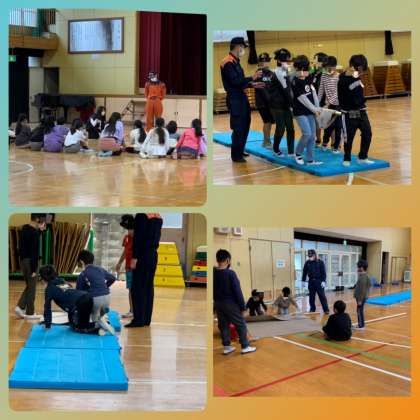 消防署と区役所の方に来ていただいて、救急搬送について知り、体験しました。(簡易担架体験)