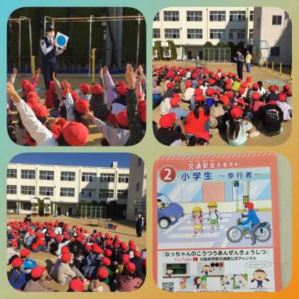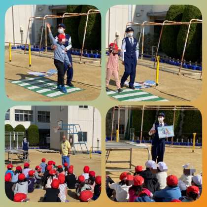 東住吉警察から来ていただいて、交通安全教室がありました。正しい歩行の仕方を理解し、横断歩道および交差点の通行の仕方を学習しました。