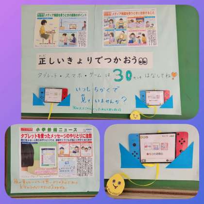 保健室の前の掲示板です。タブレット等の使い方について、掲示しています。