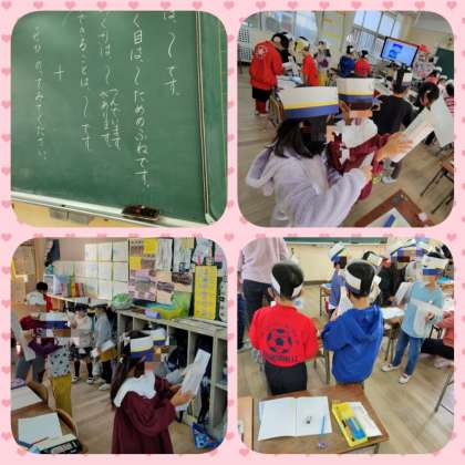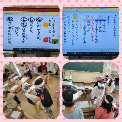 自分の調べた船についてまとめました。まとめたことを、まず隣の人と伝え合い、次にいろいろな友だちと伝え合いました。最後に振り返りを書きました。