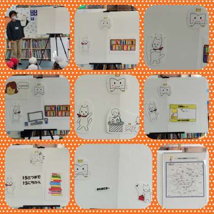 図書館について、絵本コーナーに上がる時には、靴をちゃんと揃えていました。絵本コーナーでは、東住吉図書館の「なにワン」と「本の妖精、ブッくん」に図書館のことをいろいろ教えてもらいました。
