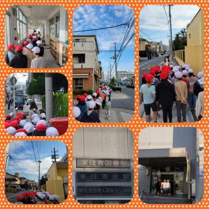 2年生が東住吉図書館へ見学に行きました。先日の交通安全学習で学んだ通り、道路を安全に歩くことができました。