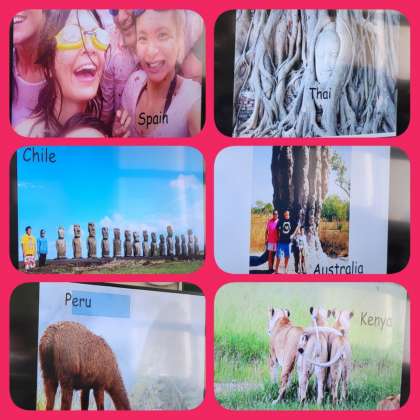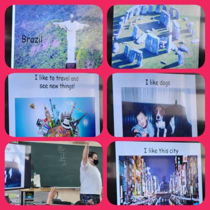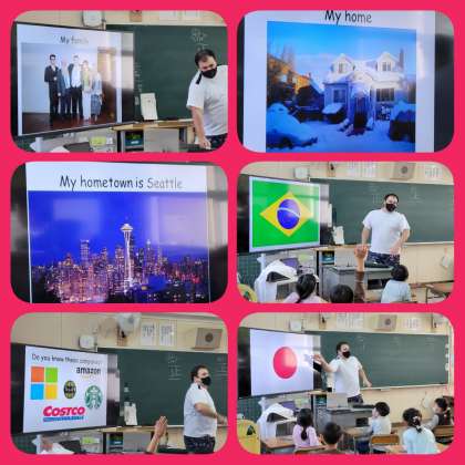 自己紹介の仕方(名前を言う)を学びました。アレックス先生の自己紹介では、色の名前や家族の呼び方なども知ることができました。