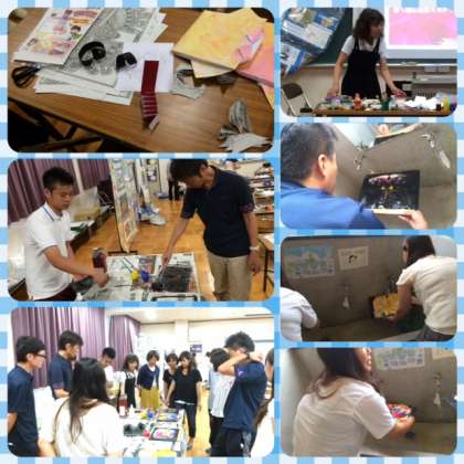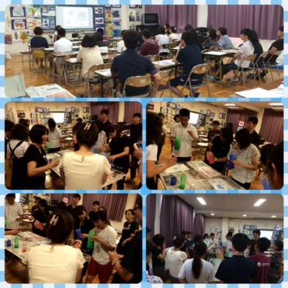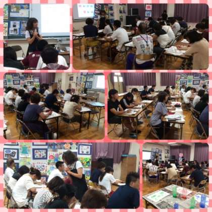 木下先生が持ってきてくださった子どもたちのたくさんの作品を鑑賞したり、授業目標を明確に示し、その観点に沿って子どもたちの活動の様子を評価するという授業の形態を学んだり、「マーブリング」「デカルコマニー」などの実技研修をしたりし、3時間の充実した研修となりました。