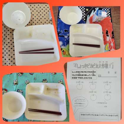 給食週間では、「しょっきピカピカ大作戦」を行います。「しょっきピカピカカード」を配りますので、食器をピカピカにできた日に、毎日忘れず色をぬってください。・・(中略)