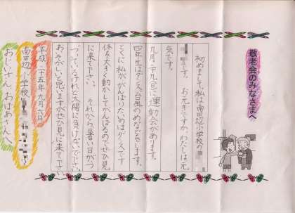 4・5年生が、地域のお年寄りの方々にお手紙を書いて交流を深めるとともに、豊かな心を育てることを目的としています。手紙は、9月22日の南田辺敬老会で配ります。
