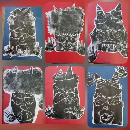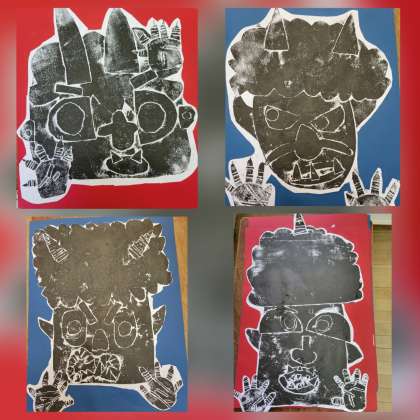 1年生の教室の後ろには、紙版画(鬼)が掲示しています。