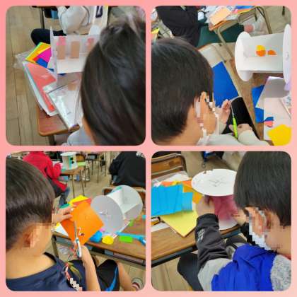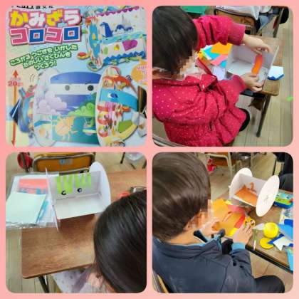 1年生は、図画工作の時間に「かみざらコロコロ」を作っています。世界に一つだけのオリジナルコロリンを目指しています。