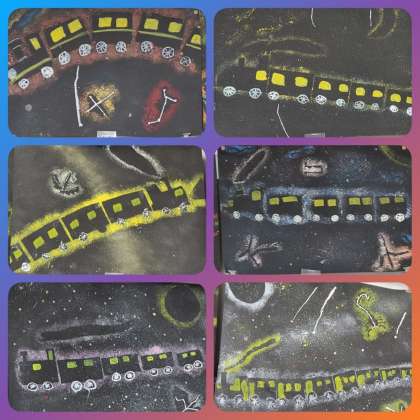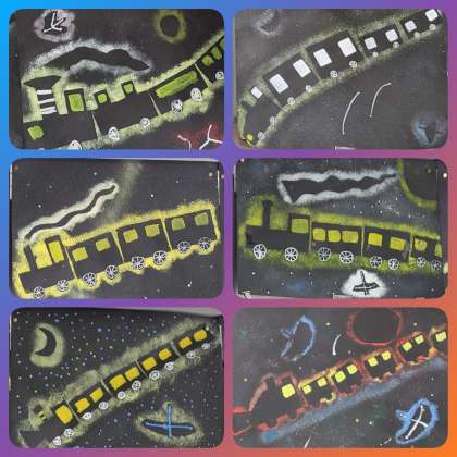 各学級の後ろの掲示には、素敵な銀河鉄道が走っています。