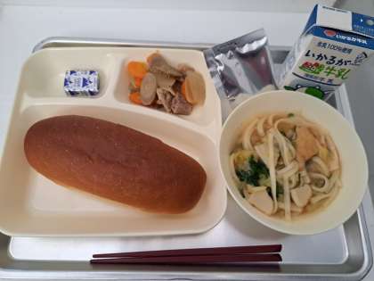 大阪の郷土料理、きつねうどんをイメージした献立です。うすあげを16分の1三角に切り、甘辛く煮て入れています。1人1袋あてのとろろこんぶを入れていただきます。とろろこんぶは、昔から大阪で作られていることから、大阪市の給食では「なにわうどん」とよんでいます。