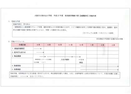 上記の制度を活用すべく、本校も5月に申請をしていました。7月末に大阪市教育委員会より、校長経営戦略予算加算配付校に選定された旨の連絡をいただきました。総額4,173,552円が配付されます。子どもたちの学力向上の一手段として活用するために、プロジェクター型電子黒板とマグネットスクリーンを8セットと算数のデジタル教科書を購入できることになりました。電子黒板については5〜6年生の各教室に設置します。また、デジタル教科書は全学年分あります。