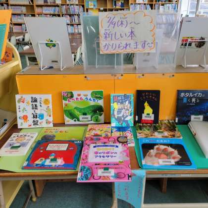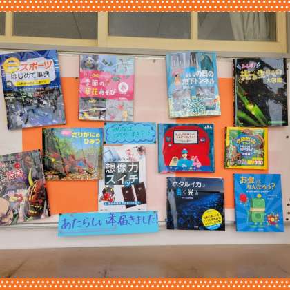 新しい本の紹介が、分かりやすく掲示されています。子ども達は、うれしそうに本を手にとって見ています。