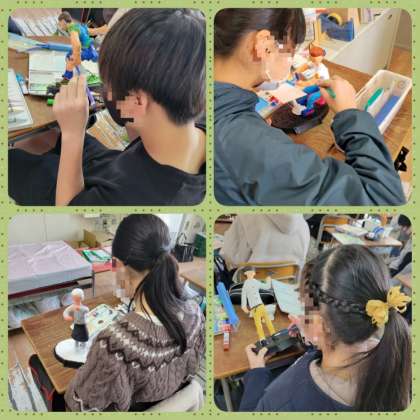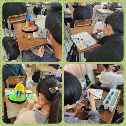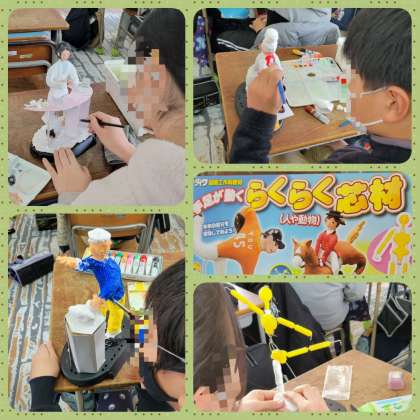 心材にポーズを付けて、紙粘土で肉付けしていきます。題材は「12年後のわたし」です。12年後、6年生の子ども達は20代前半です。その頃の自分を思い浮かべ形に表していきます。