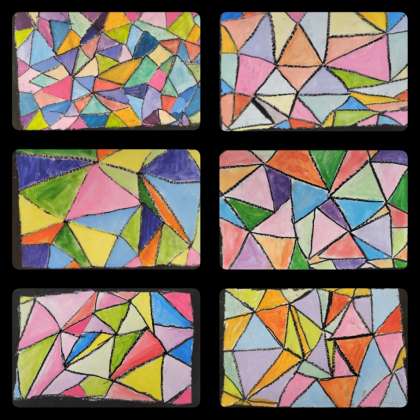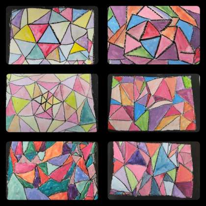 4色の絵の具(赤・青・黄・白)を使い、いろいろな色を作って塗りました。綺麗なステンドグラスが出来ました。