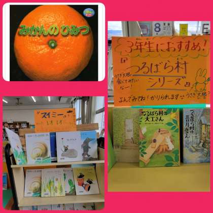 また、図書館では、3年生におすすめの「つるばら村シリーズ」や1年生におすすめの「スイミーを書いたレオ・レオニさんの本」のコーナーが、国語の授業と関連して展示してあります。