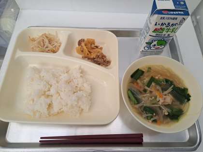 豚肉とだいこんをにんにくの風味をつけて炒め、コチジャン、砂糖、こいくちしょうゆで少し甘辛く味つけした炒め物です。美味しかった!の声がたくさん聞けた献立でした。